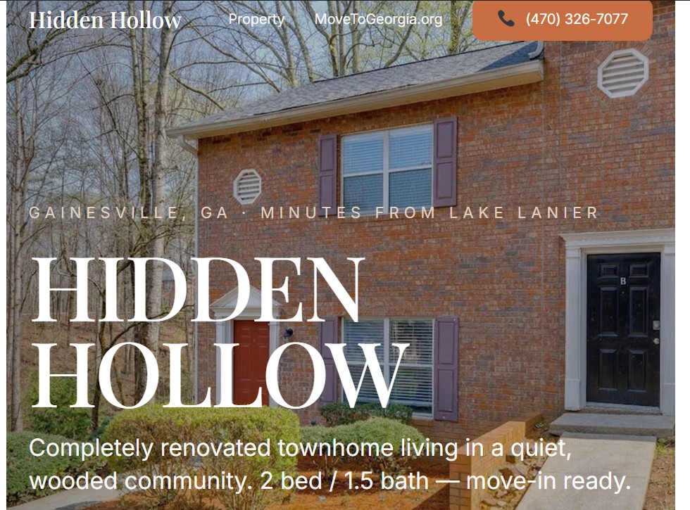 Hidden Hollow Property MoveToGeorgia.org 📞 (470) 326-7077 GAINESVILLE, GA · MINUTES FROM LAKE LANIER Hidden Hollow Completely renovated townhome living in a quiet, wooded community. 2 bed / 1.5 bath — move-in ready. 📞 Schedule a Tour View Property Details Featured Listing 4030A Hidden Hollow A completely renovated 2-bedroom, 1.5-bathroom brick townhome with new cabinets, […]